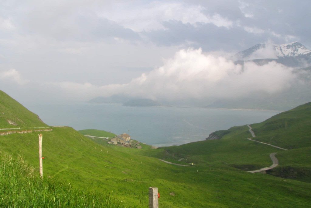 Am Pass befindet sich eine kleine Bar, die Bar de Lancebranlette. Die Bedienung war nett, der Cafe au Lait Grande sehr lecker, nur das Käsesandwich etwas trocken. Aber das könnte auch daran liegen, dass ich ihre Frage “just cheese” bejaht hatte. Es dauerte nicht lange und auf dem kleinen Schotterplatz vor der Bar rollte eine Buell aus – der Typ aus Genf. Mich hat er ohne Helm und Jacke nicht gleich erkannte, die dunkelrote 750er war ihm noch im Gedächnis geblieben. Nach einem halb Stündchen sprangen wir wieder in die Kombis und ab ging es im Tiefflug ins Tal, er vorneweg. So gut passen tut es selten: genau die richtige Speed und immer mit Reserve. Unten an der Kreuzung drückte ich zweimal die Hupe, die Finger seiner linken Hand formten ein V – wie schon einmal erwähnt, es bedarf nicht immer vieler Worte.