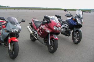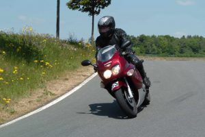 Die praktischen Übungen begannen mit Langsamfahren: erst geradeaus, dann zunehmend enger werdende Kreise, zum Schluß wurden Achten gefahren. Ziel war das Gefühl für das Gleichgewicht sowie das Spiel mit Kupplung und Bremse. Im gleichen Parcour wurden dann Notbremsungen geübt: erst nur hinten, dann nur vorne, dann ankern auf beiden Rädern. Die letzte Übung im ersten Abschnitt war das Ausweichen mit Lenkimpuls – gleichzeitig die erste Übung, bei der ich eindeutig Defizite bei mir ausmachte. Sehr gut fand ich eine Übung in der deutlich wurde, dass die theoretisch mögliche Kombination aus erst Bremsen und dann Ausweichen bei Geschwindigkeiten im Stadtbereich schlichtweg praxisfern ist.
