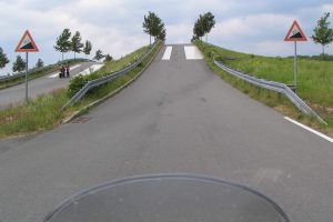 Die nächste Übung war relativ kurz, es ging um das Fahren auf schlechten Strecken – der Instruktur fuhr vorneweg. Nach zwei Schotterstrecken fuhren wir zu einem Bereich auf dem Testgelände, auf dem neun numerierte Strecken nebeneinander angelegt waren. Ich erinnerte mich an den Hinweis von der Begrüßung, dass die Strecken 8 und 9 – die 9 entspräche “Afrika” – nur mit Enduros befahren werden dürften. Es hätten zwar auch schon Fahrer mit Sportmotorrädern probiert die 9 zu bezwingen, abgerissene Ölablaßschrauben und eingedrückte Unterböden hätten in vielen Fällen aber für ein abruptes Trainingsende gesorgt. Etwas komisch war mir schon, als wir auf die 7 fuhren – auf meiner GSX750F bereits fast unfahrbar – danach ging es erfreulicherweise zurück zur 6.
