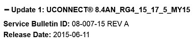 auf (Update: aktuell ist die Website für Deutschland gesperrt, über VPN Zugänge im Ausland sollte es weiterhin klappen). Dort gibt man in dem Eingabefeld die eigene VIN ein und klickt auf den ‘CHECK FOR UPDATES’-Button. Sofern es ein Uconnect Update gibt, dass man einspielen kann, wird eine Box mit den folgenden Informationen angezeigt: